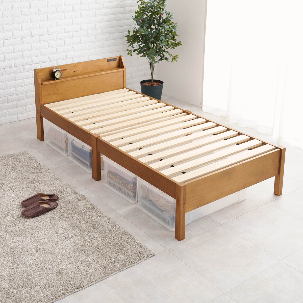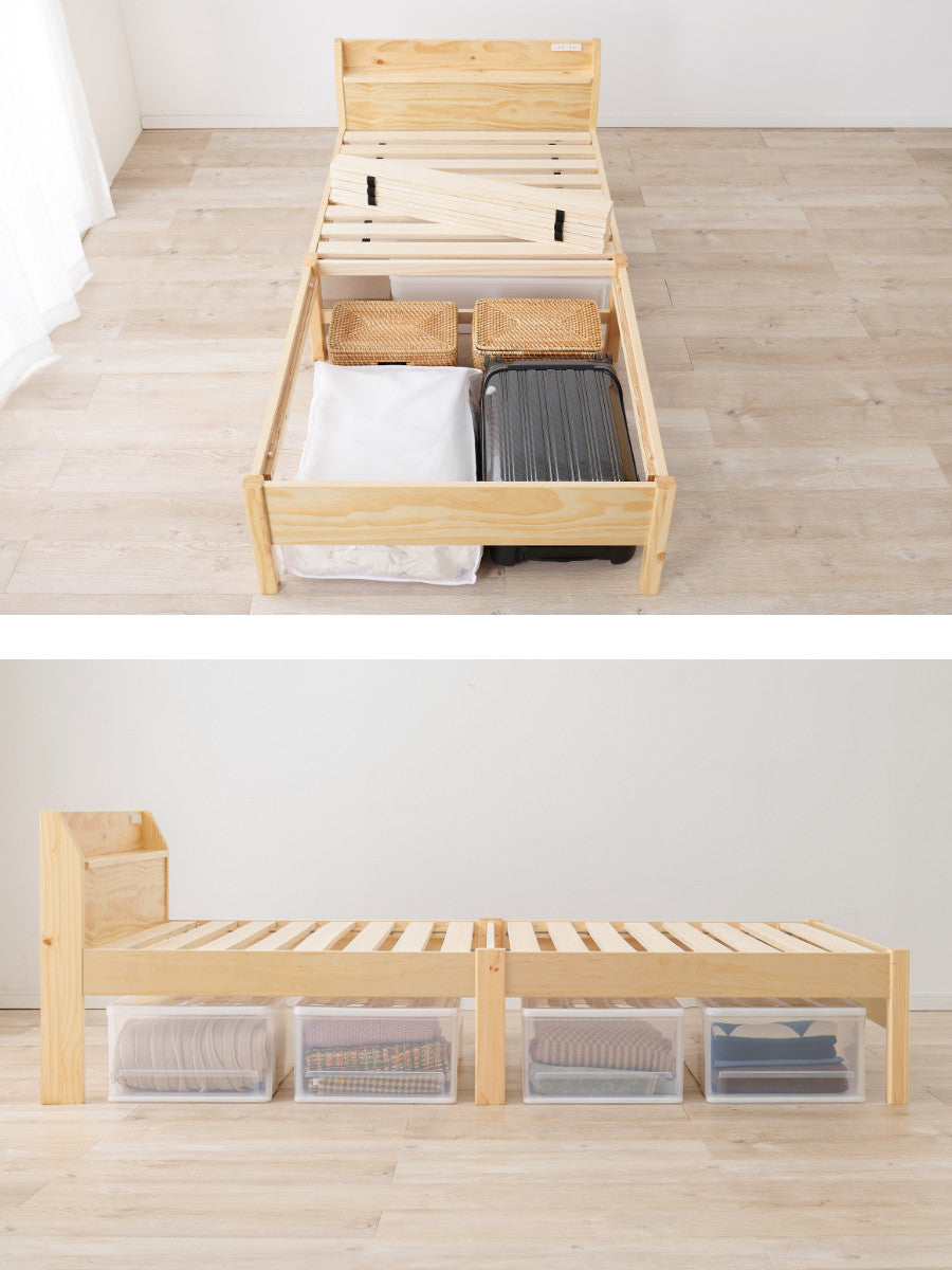 ネジも工具も不要、パーツを差し込むだけで簡単に組み立てることができるベッドフレームです。木の温もりが感じられる柔らかなパイン材を使用しているので、美しい木目と経年による色の変化を楽しめます。