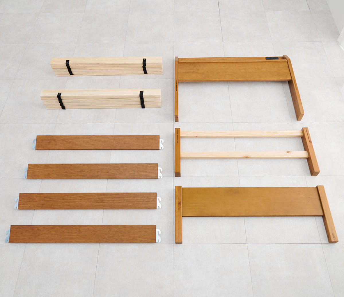 ベッドが入っているとは思えないほどコンパクトな梱包でお届けします。組み立て家具や工具を扱うのが苦手な方でも比較的簡単に組み立てることができます。もちろん解体も簡単なので、引越しが多い方や頻繁に模様替えをしたい方にもおすすめです。