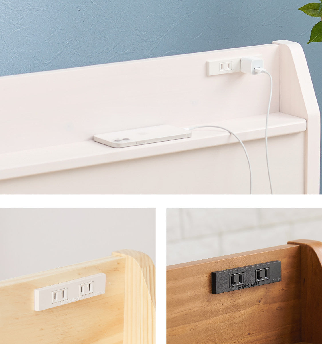 眼鏡や目覚まし時計などの小物を置くことができる宮棚付きです。棚には2口コンセントが付いているので、枕元でライトを灯しながら同時にスマホやタブレットを充電することができます。