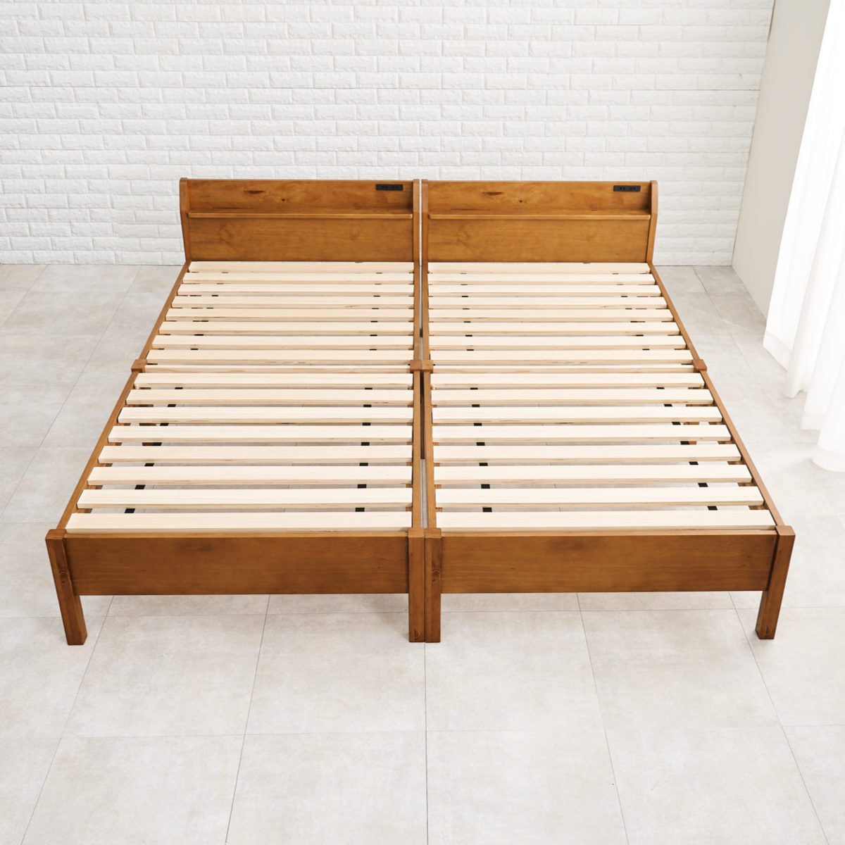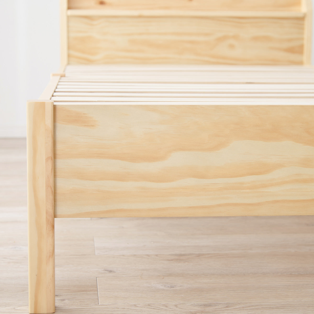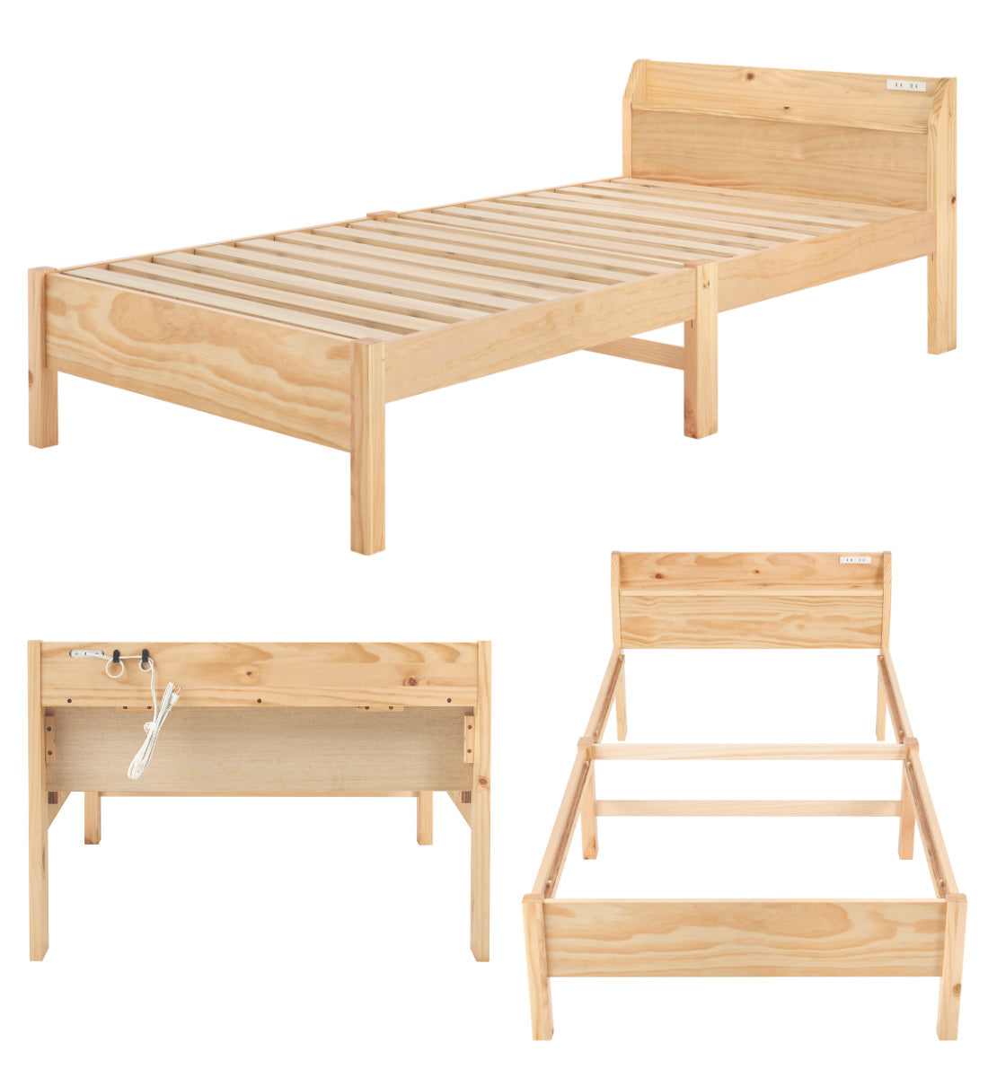 ネジも工具も不要、パーツを差し込むだけで簡単に組み立てることができるベッドフレームです。木の温もりが感じられる柔らかなパイン材を使用しているので、美しい木目と経年による色の変化を楽しめます。