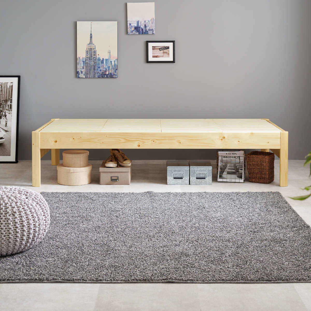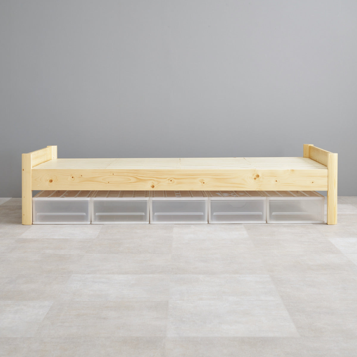 たったの3分で簡単に組み立てることができるベッドフレームです。パーツを差し込むだけなので、組み立て作業が苦手な方でもすぐに組み立てることができます。天然木の温もりが感じられる柔らかなパイン材を使用し、美しい木目と経年による色の変化を楽しめます。