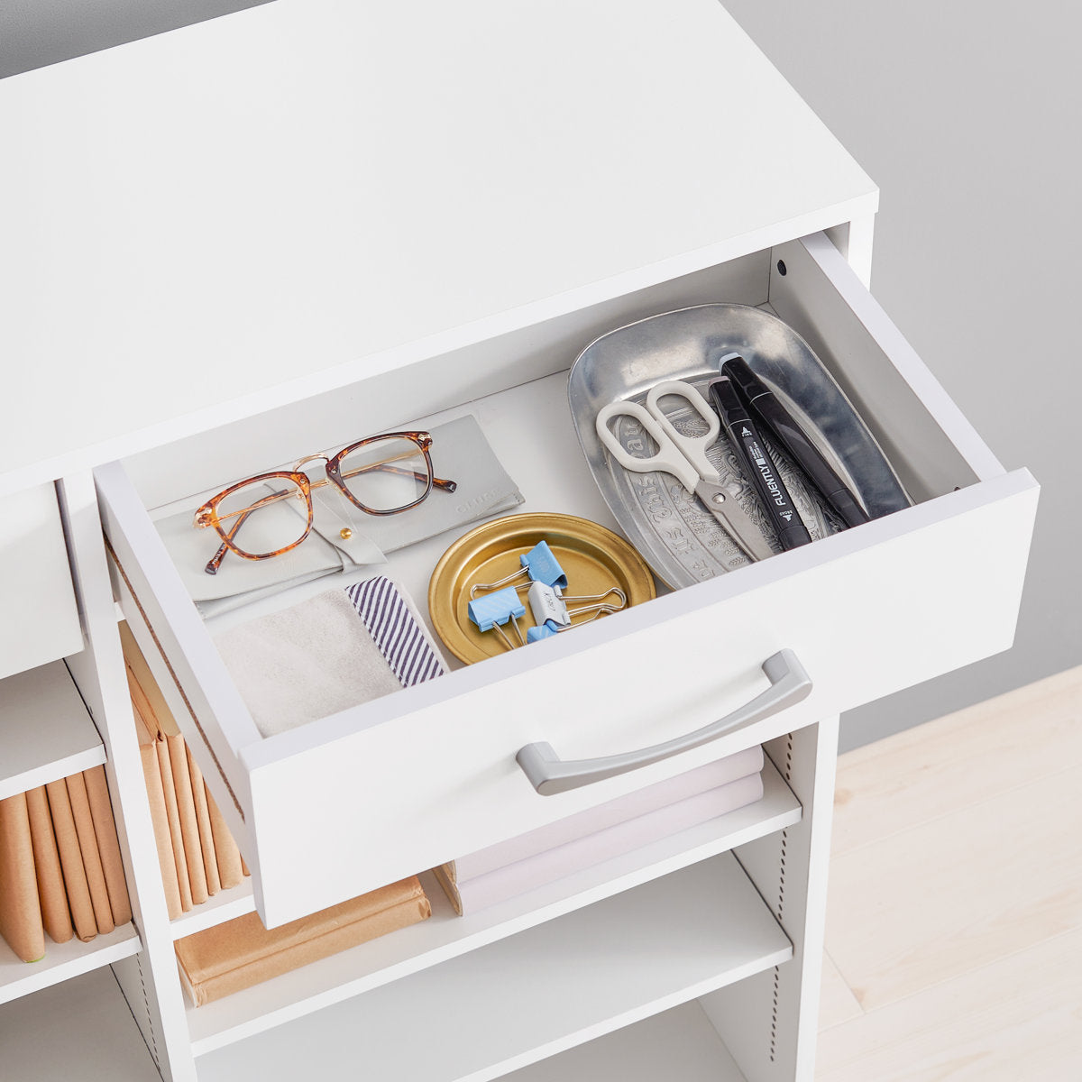 一番上の段は引出し付きなので、ごちゃつきがちな小物類を収納できます。