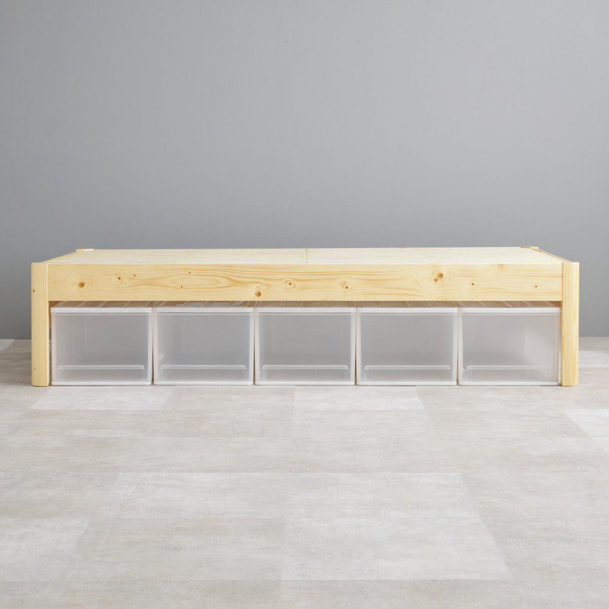 中央の脚を無くしたことで、ベッド下に長めのラグが収納できるようになりました。大型のキャリーバッグや収納ケースなど、かさばる物もたっぷりと収納できます。収納ケースは横に並べて隙間なく収納できるので、お部屋がスッキリと片付きます。