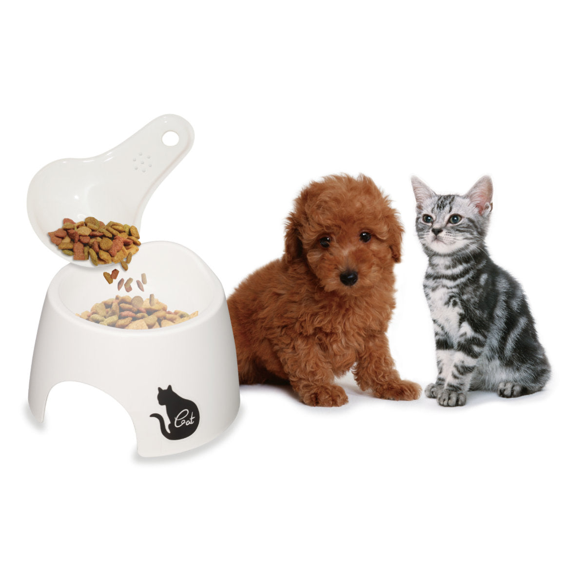 猫ちゃんや小型のワンちゃん用のペットフードスコップです。ストレスフリーで毎回均等な量のエサをあげられます。多頭買いであげる量がばらばらの場合でも、すくうと量るが同時にできるのでごはんの準備がさっとできます。