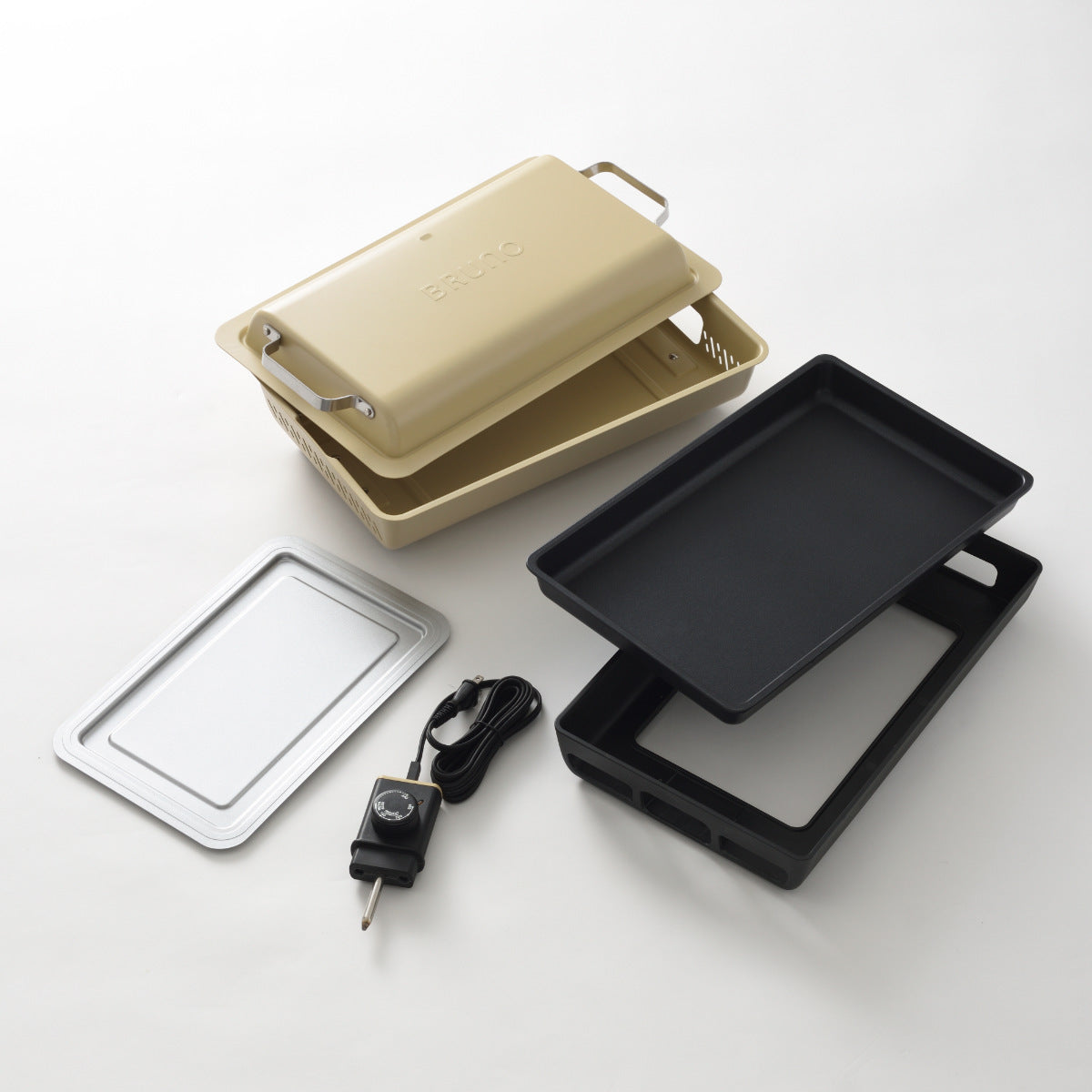 材質 | フタ、ベース:スチール 取っ手、脚:ステンレス プレート:アルミニウム合金(両面ふっ素樹脂塗膜加工) 遮熱板:ガルバリウム鋼板 プレートトレイ、コントローラー:フェノール樹脂 |