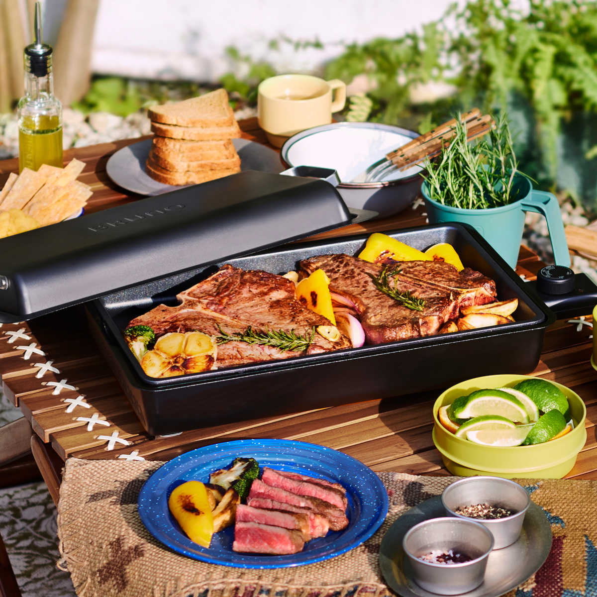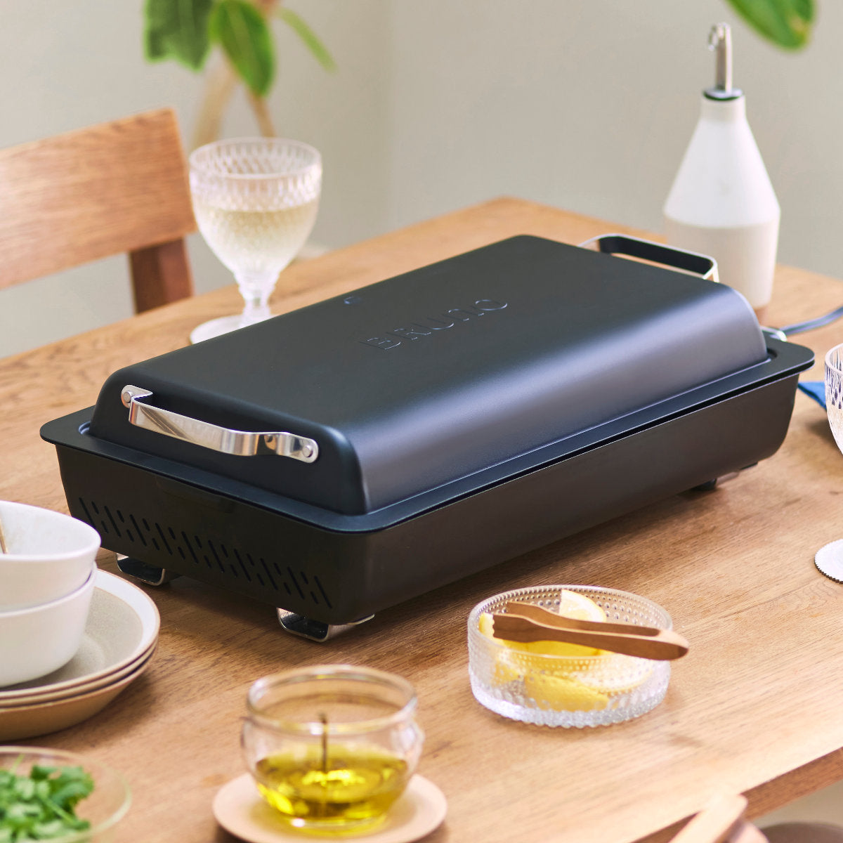 使いやすく片付けやすい、フラットタイプのホットプレートが登場しました。今までにないスマートでギアライクなデザインが魅力的で、お庭でのパーティーやBBQ、キャンプご飯などアウトドアシーンのお料理にぴったりです。