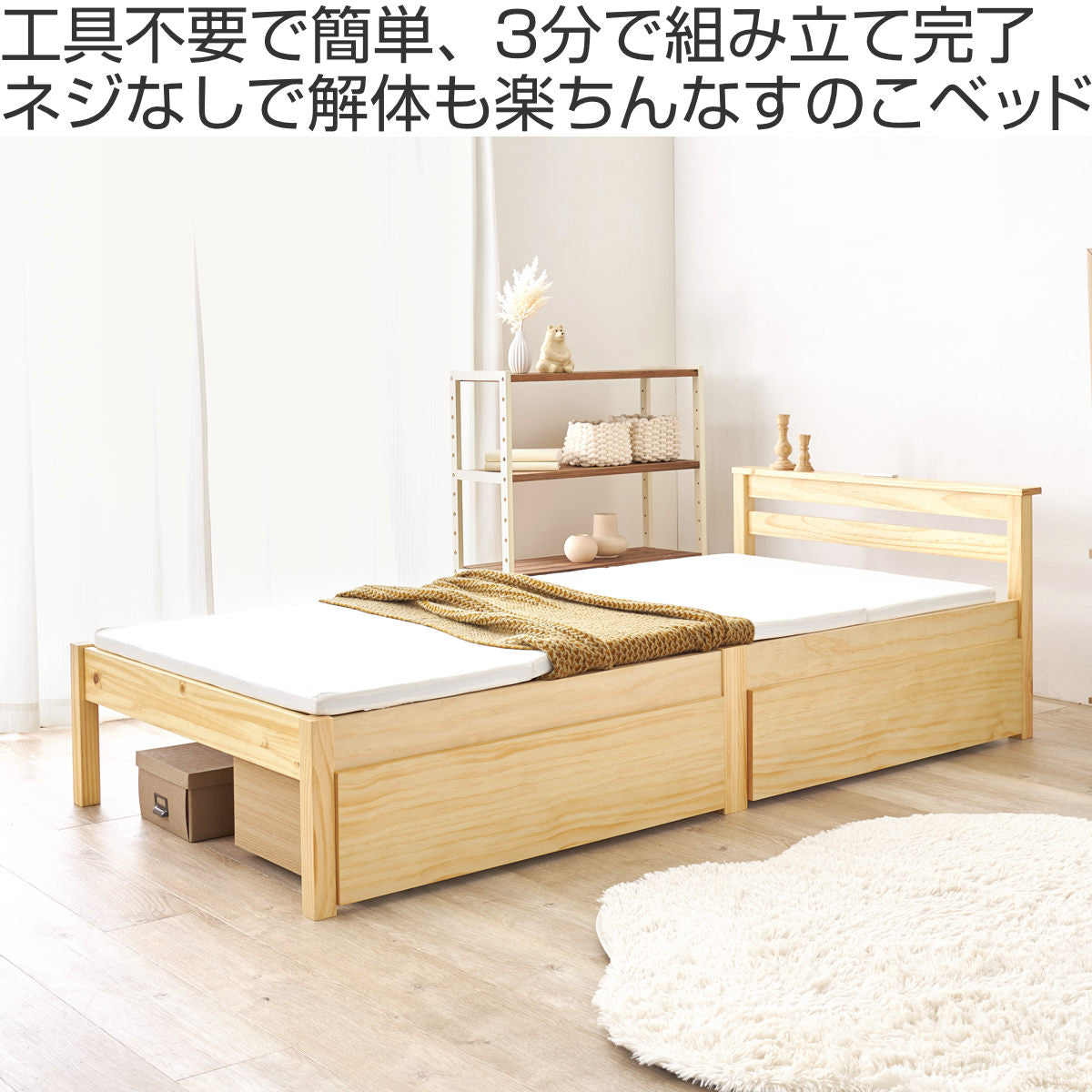 ネジも工具も不要、簡単に組み立てることができるベッドフレームです。パーツを差し込むだけなので、組み立て家具が苦手な方でもたった3分で組み立てることができます。天然木の温もりが感じられる柔らかなパイン材を使用し、美しい木目と経年による色の変化を楽しめます。