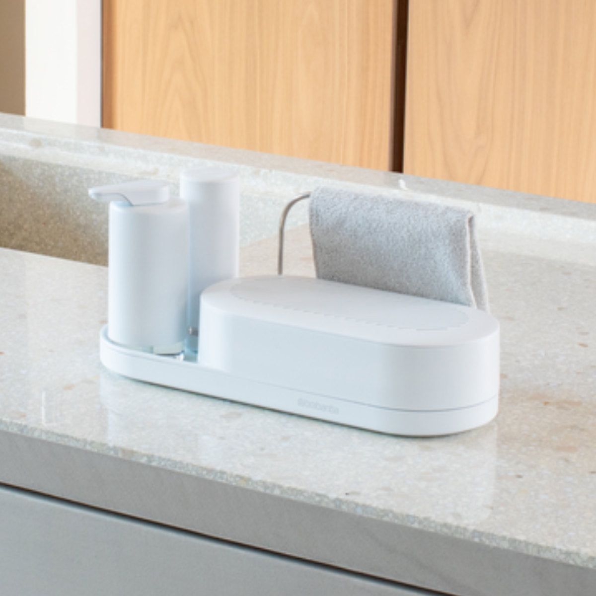 ソープディスペンサー、ソープスクイージー、オーガナイザーがセットになっています。シンク周りの必要な物をすっきりひとまとめにできます。耐腐食性の素材で作られており、使用後は94%リサイクル可能で環境に優しいです。