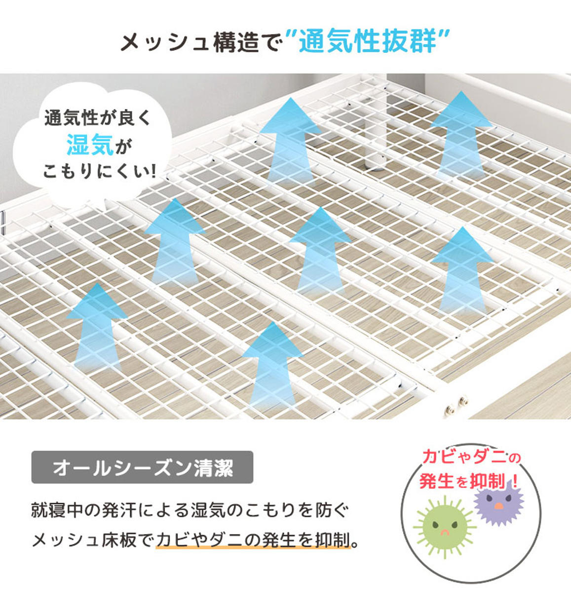 通気性が良くカビが発生しにくいスチール製のメッシュ床板です。汗や湿気を逃し、年中快適に睡眠をとることができます。