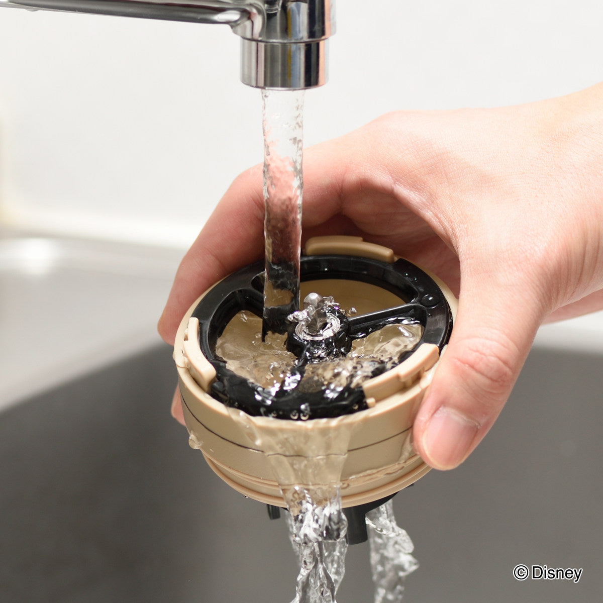 モーター部以外のフタやミル部、カップは食器用の中性洗剤を使って洗浄することができるので、いつも清潔に保てます。モーター部は乾いた布か、水道水を含ませてかたく絞った濡れタオル等で拭いてください。絶対に水洗いはしないでください。