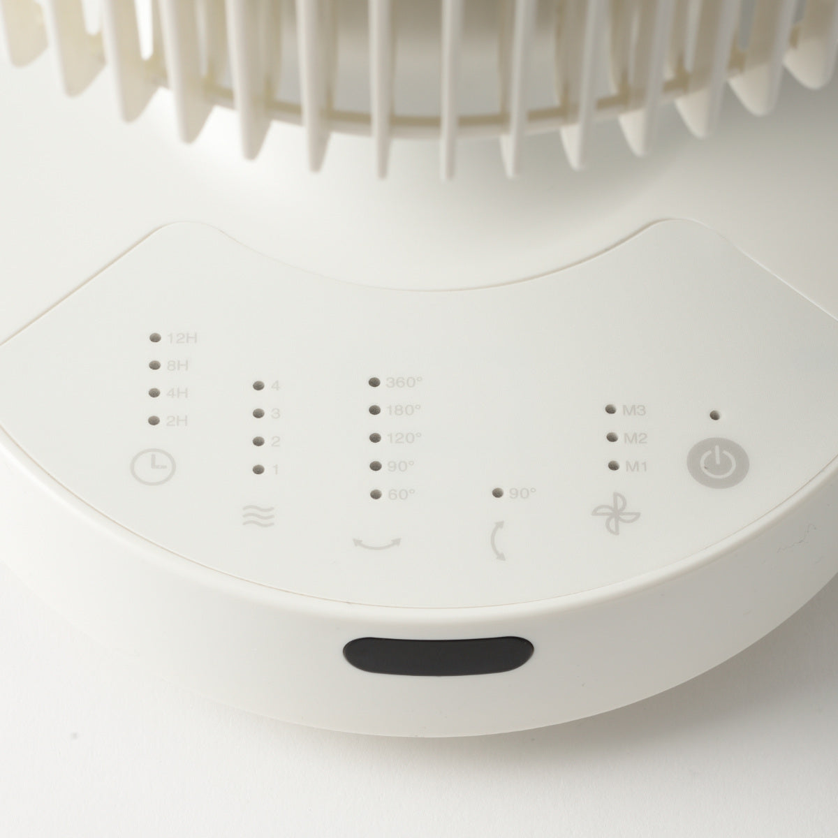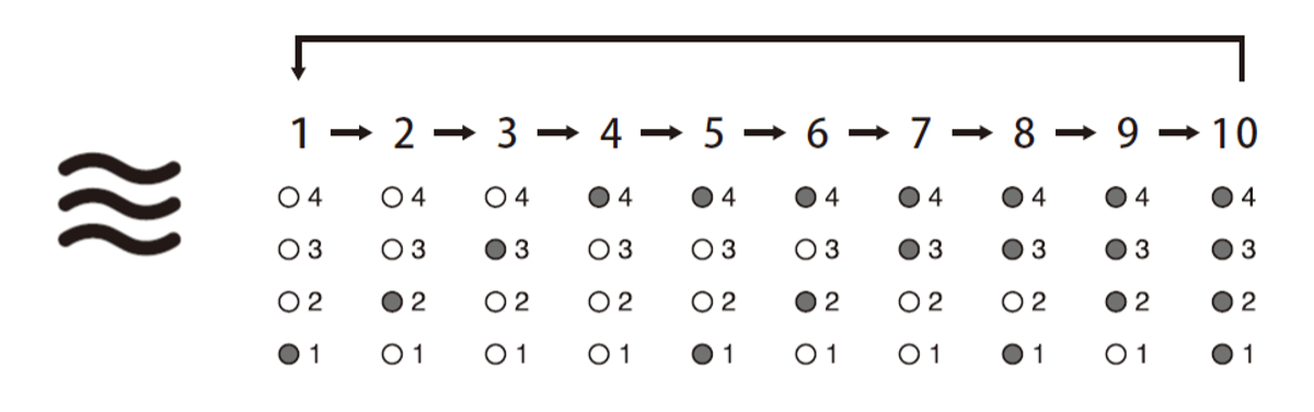 微風から強風まで10段階で設定でき、ボタンを押すたびに風量が切り替わります。点灯している風量ランプの数字の合計が風量を示しています。