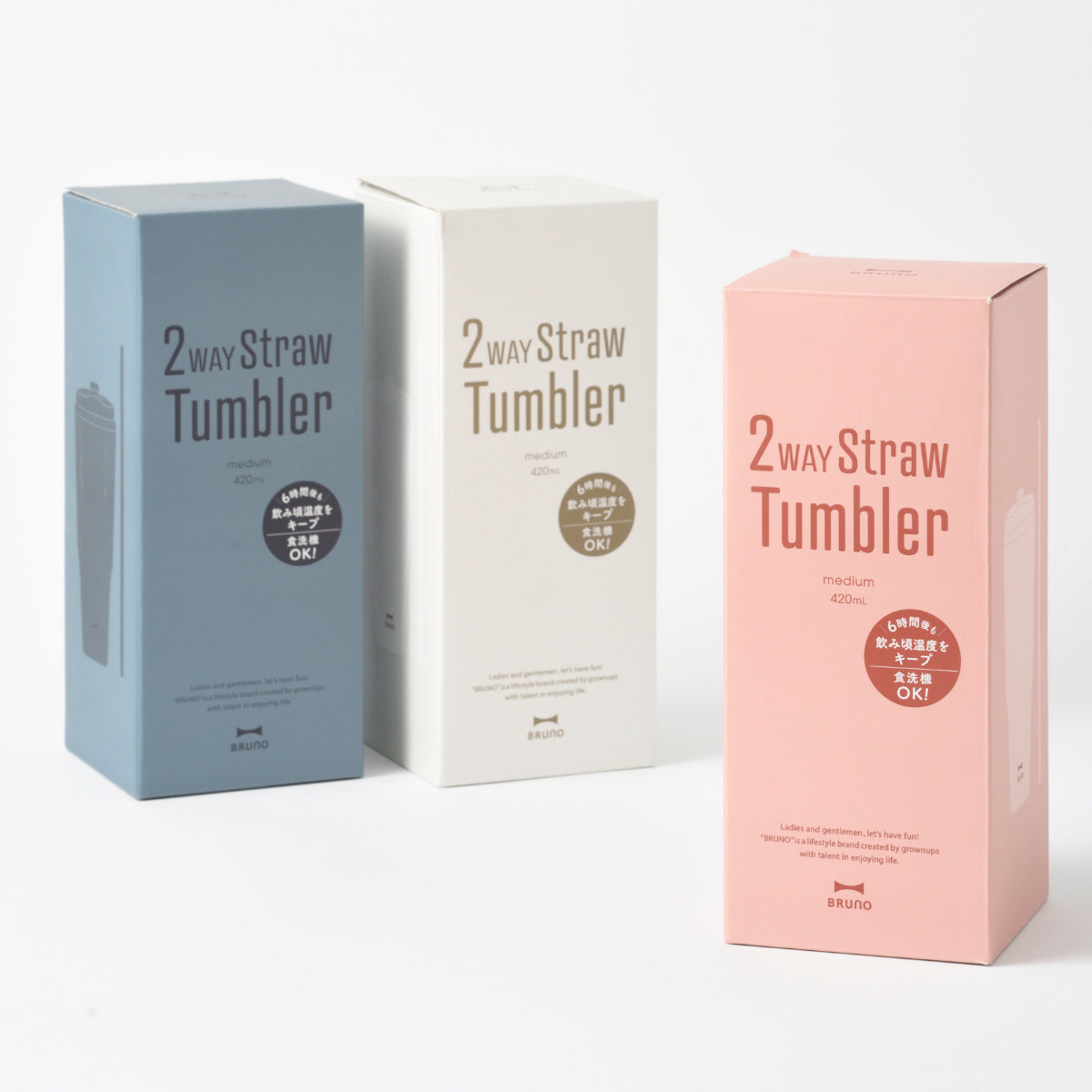 ファッションアイテムのように持ち歩ける、マットな質感が魅力のBRUNOらしいデザインです。シンプルで柔らかな色合いのホワイト、ピンク、引き締まった印象の大人っぽいブルーグレーからお選びいただけます。