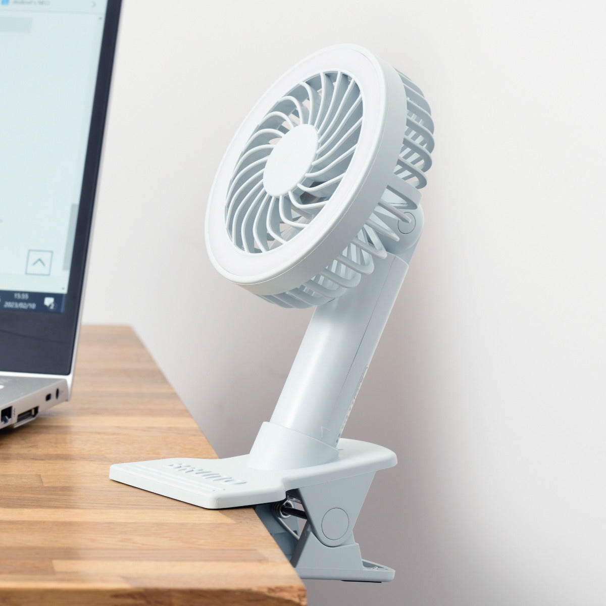 クリップと灯りが付いた、使い方自在のミニ扇風機