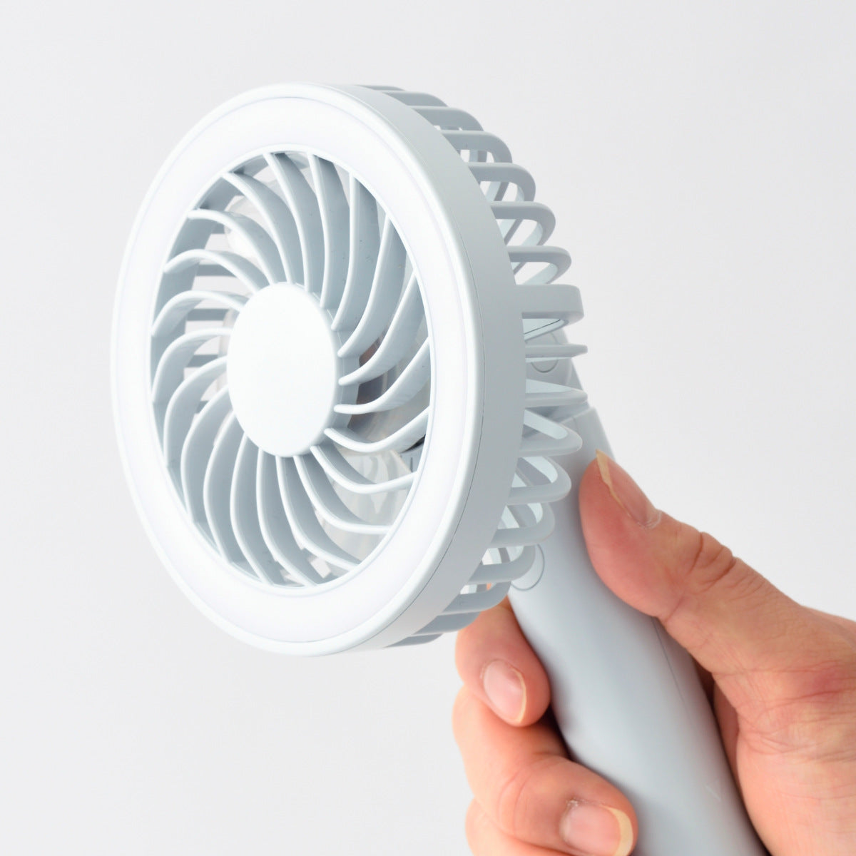 リング状のライト搭載で、夜道でも明るく安心です。夜のアウトドアや、暗い場所での写真撮影にも最適です。ファンとライトはそれぞれ単独・同時どちらでも使用できます。