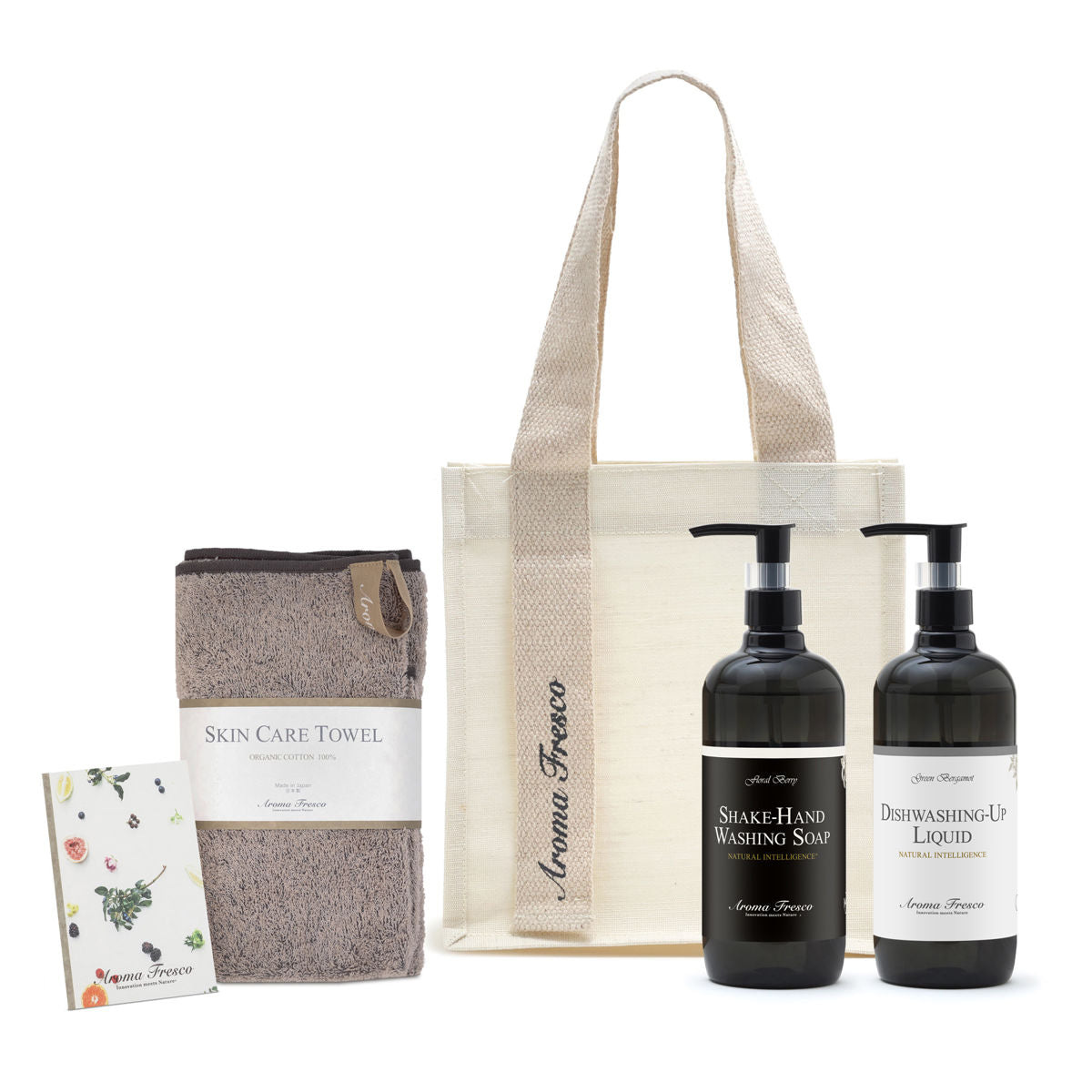 天然香料の素敵なアロマが香る、手肌・環境に優しい天然由来成分で作られた、ハンドソープと食器用洗剤にタオルがセットになったギフトセットです。