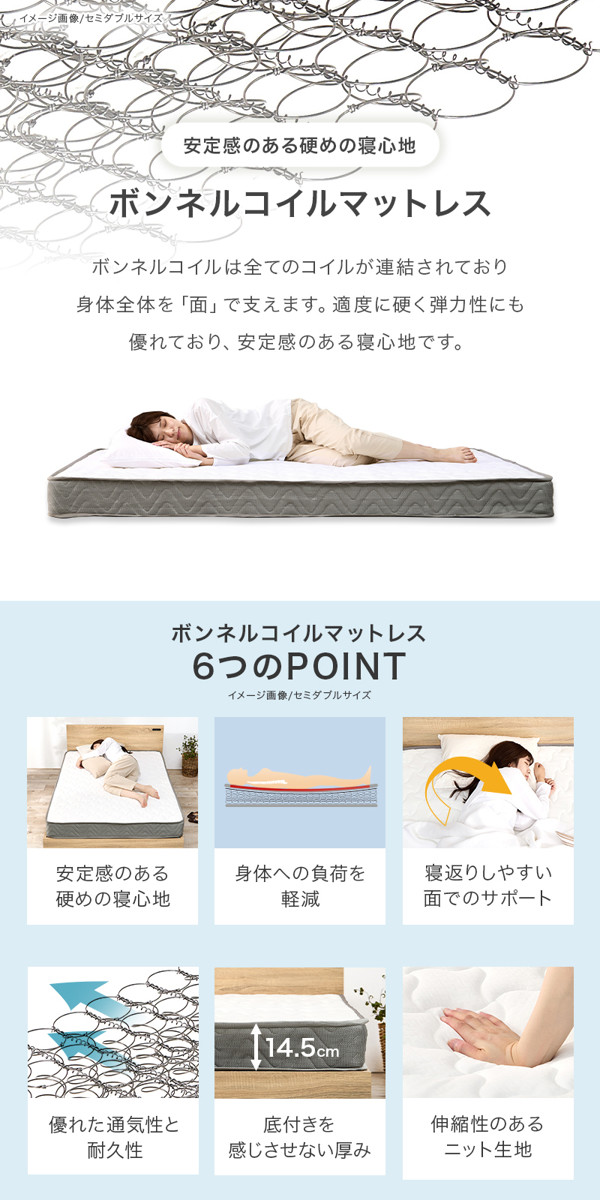 コイル同士が連結されており、体を面でしっかりと支えてくれます。マットレス内部の通気性が良く、耐久性が高いのも特徴のひとつです。表面の伸縮性に優れたニット生地が寝返りのときも体に優しくフィットします。