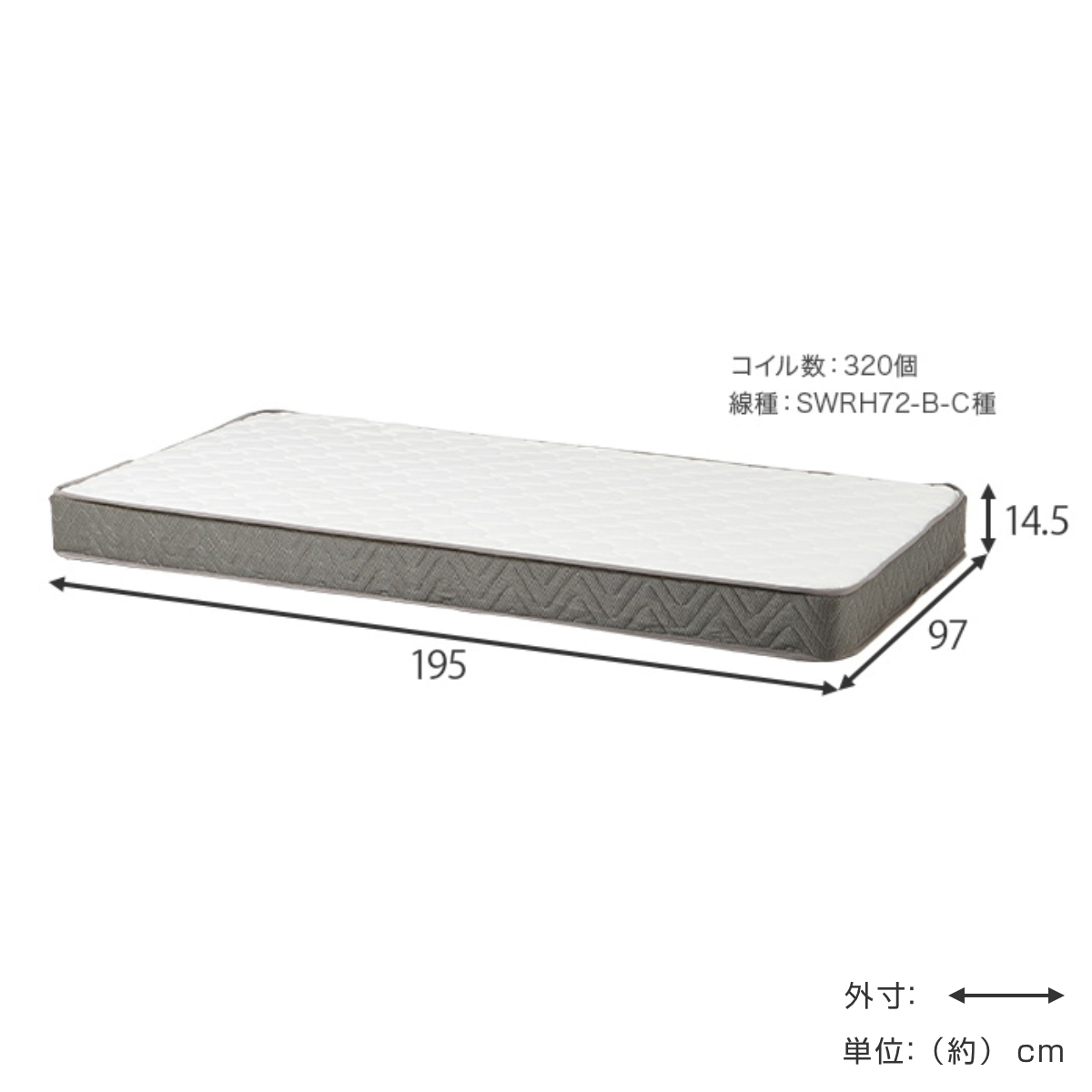 サイズ | ベッド:約 幅100×奥行208.5×高さ64.5(cm) マットレス:約 幅97×奥行195×高さ14.5(cm) |