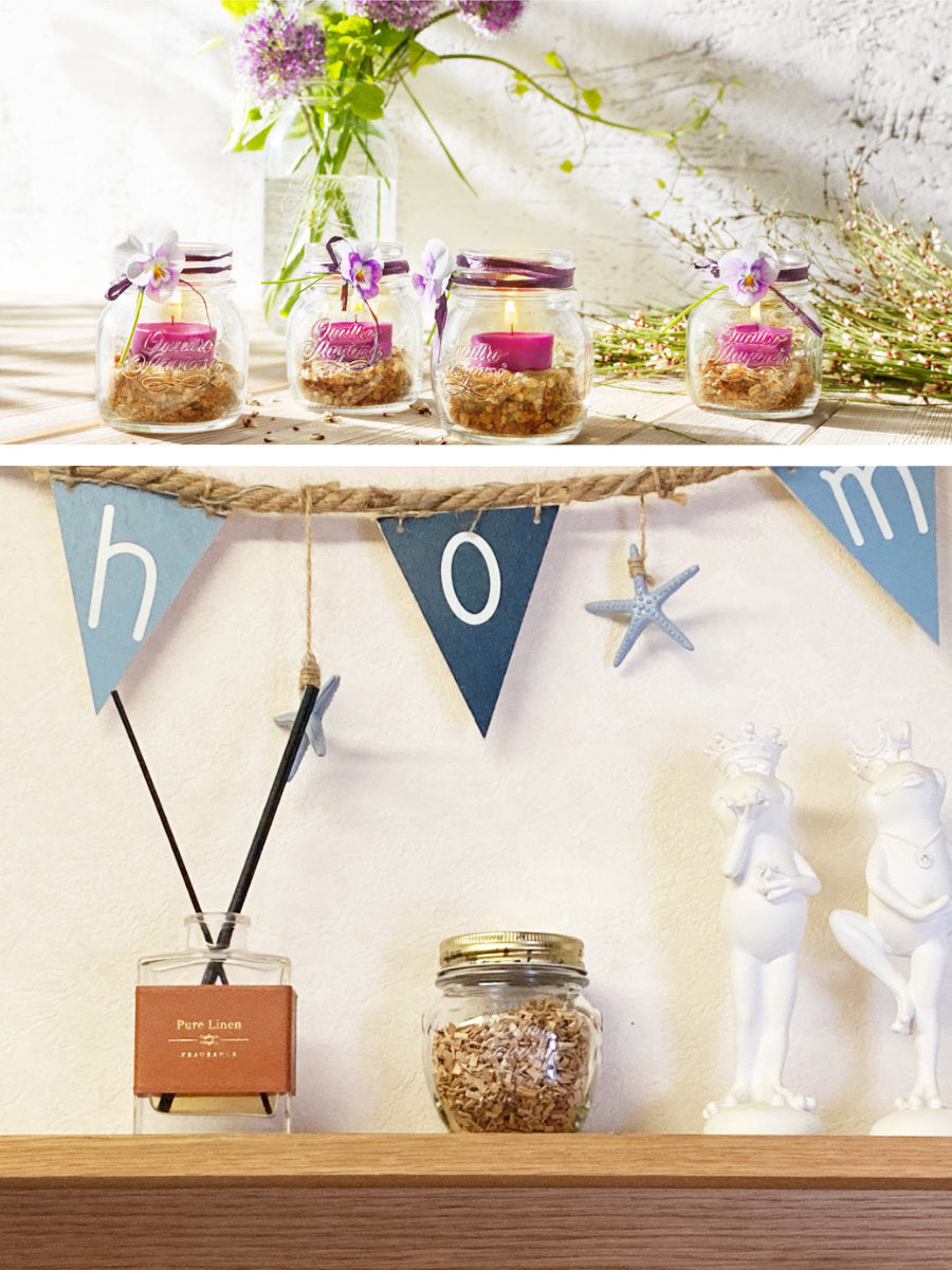 ドライフラワーやビー玉、小さな貝殻やキャンドルを入れて飾れば、ナチュラルで温かみのある空間を演出できます。棚やキッチンカウンターなどにさりげなく置くだけで、ヨーロピアンテイストの上質な雰囲気を演出できます。