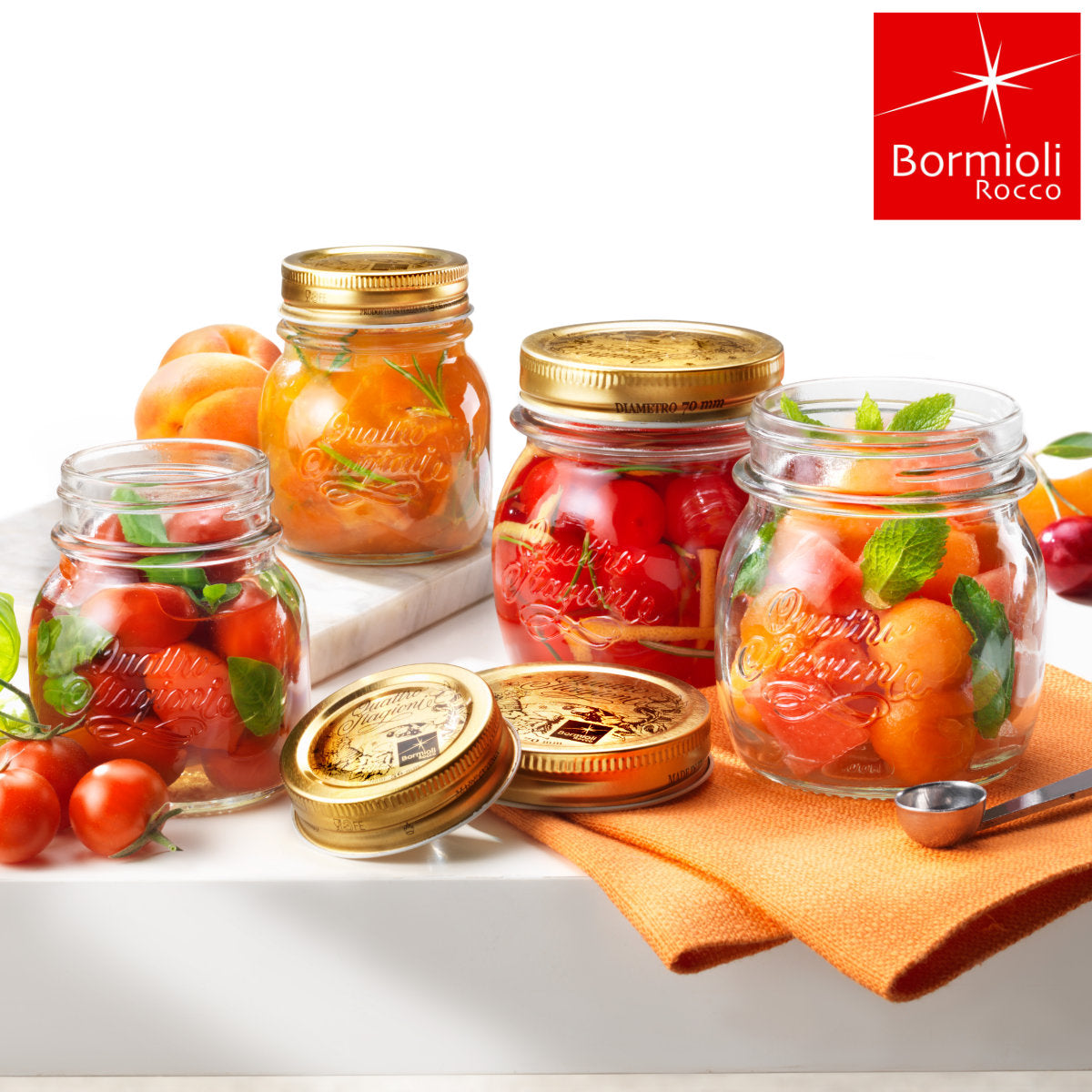ヤングコーンやパプリカを入れてピクルスを作るのはもちろん、果実のシロップ漬けやジャムなど、自家製保存食にも最適です。ガラス容器なので、中身の色や質感が美しく映えるためキッチンやテーブルに出して置いてもOK。