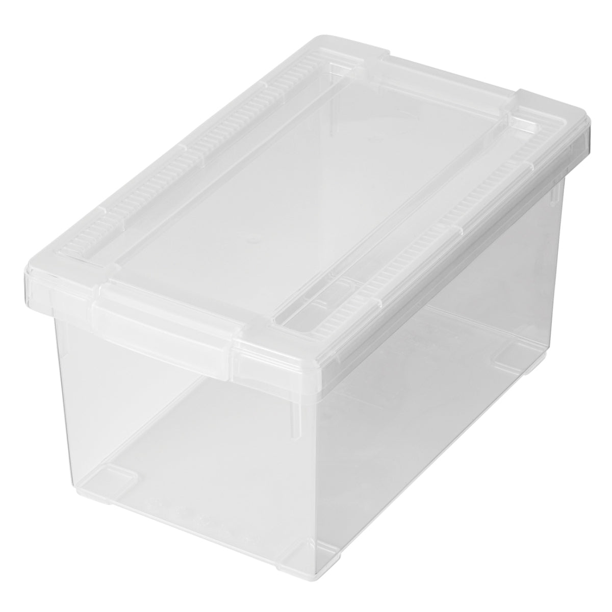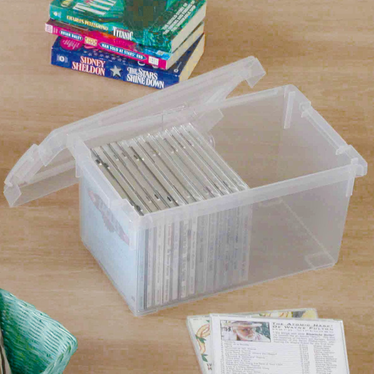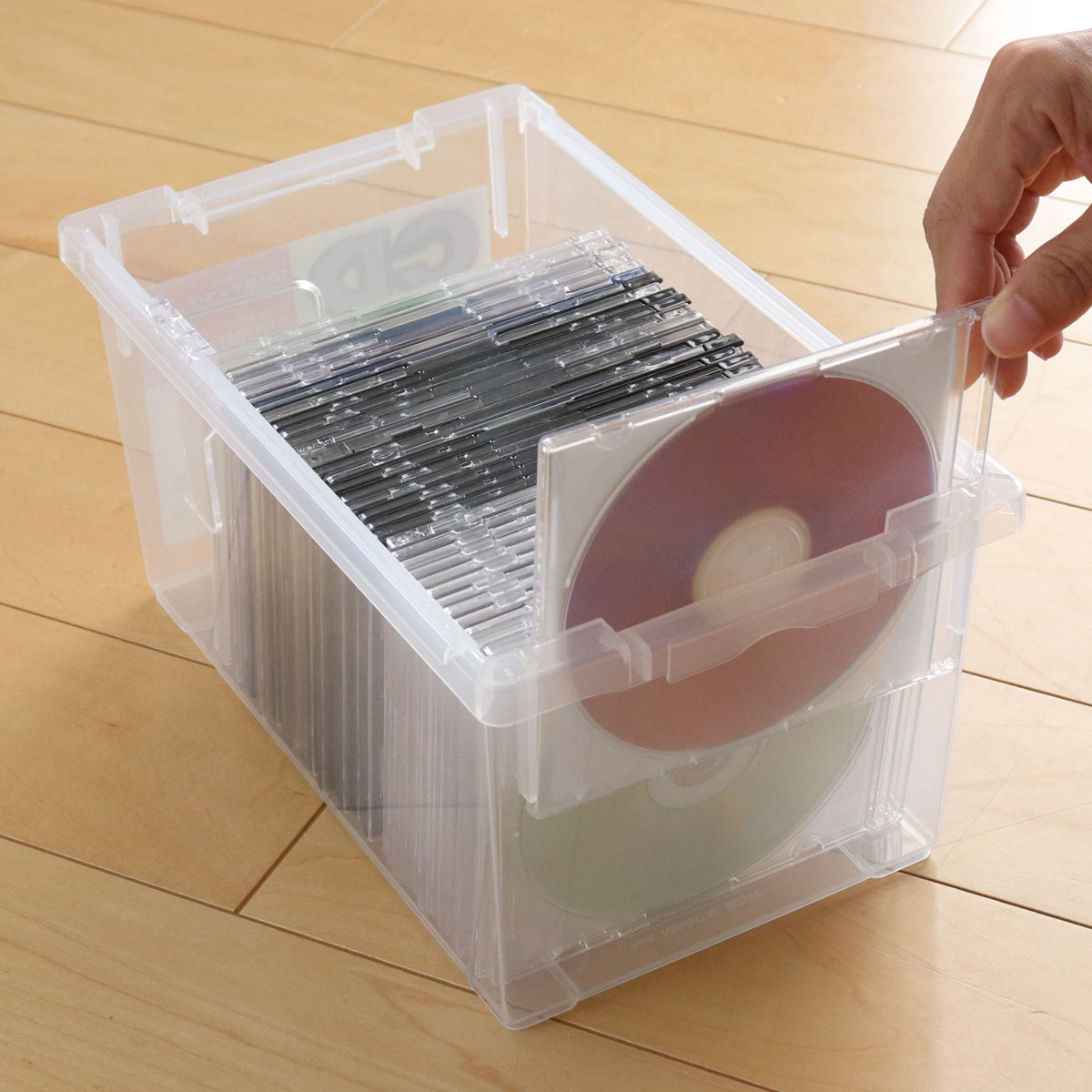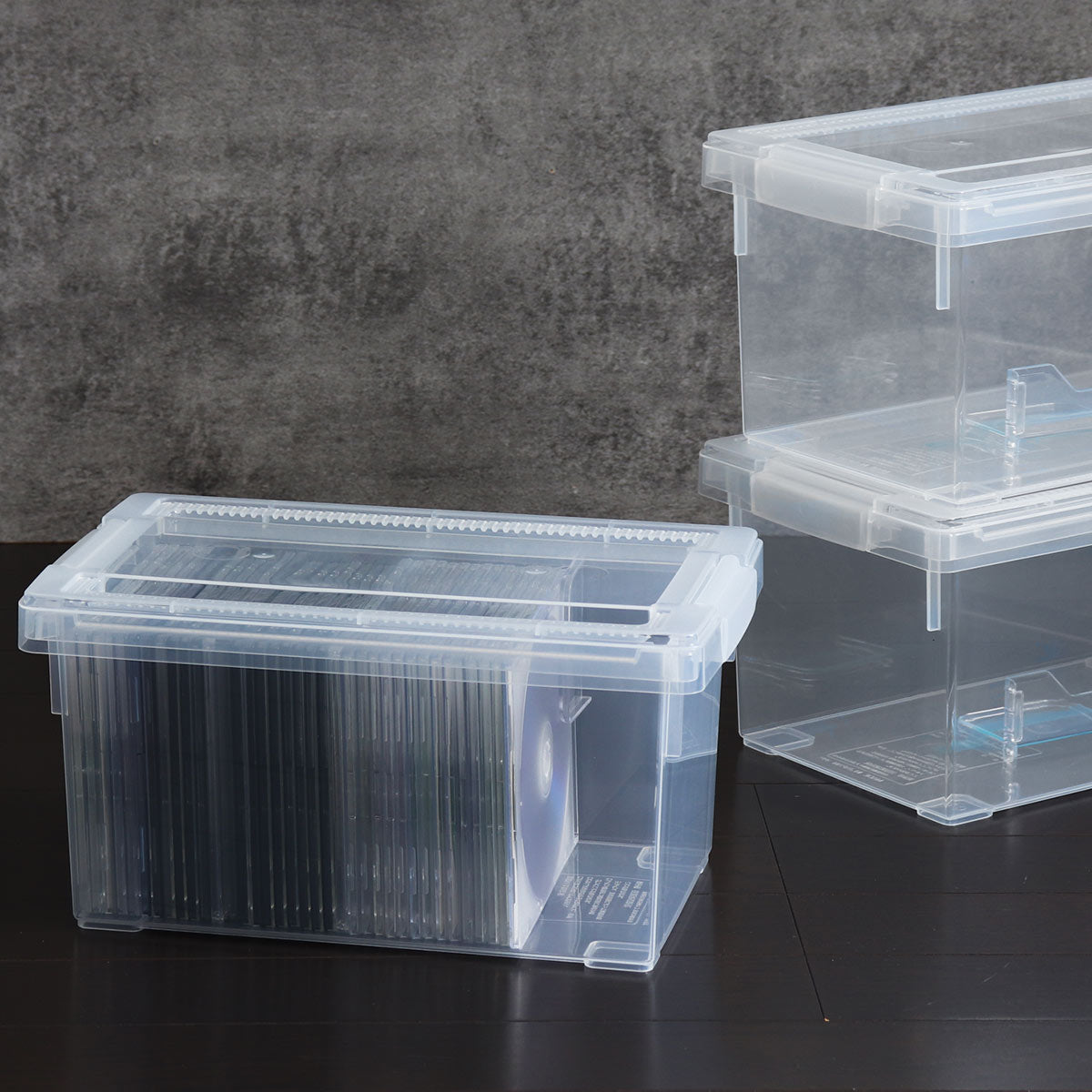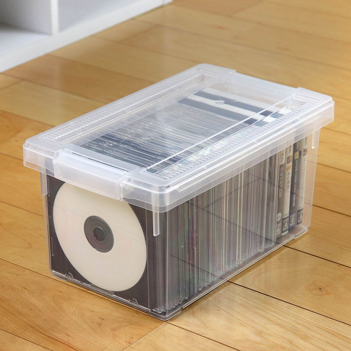 フタをしていても中身が見えるオールクリアタイプなので、収納されているものが一目で確認できます。ケースに収納したままでも側面から背表紙が見えるので、積み重ねていても探しやすいです。