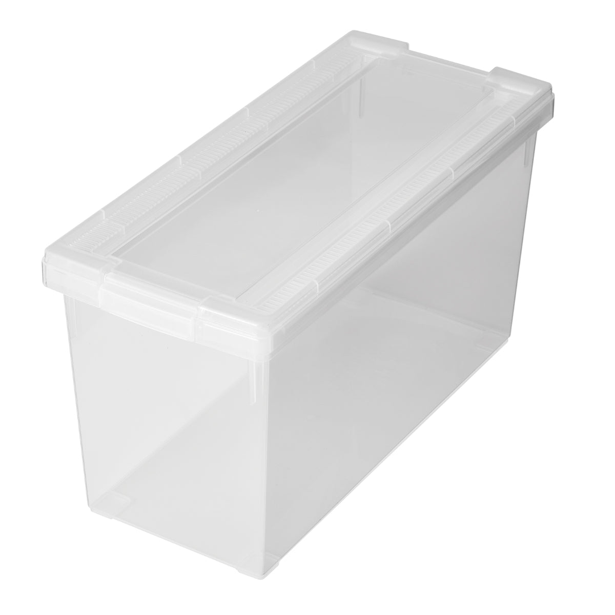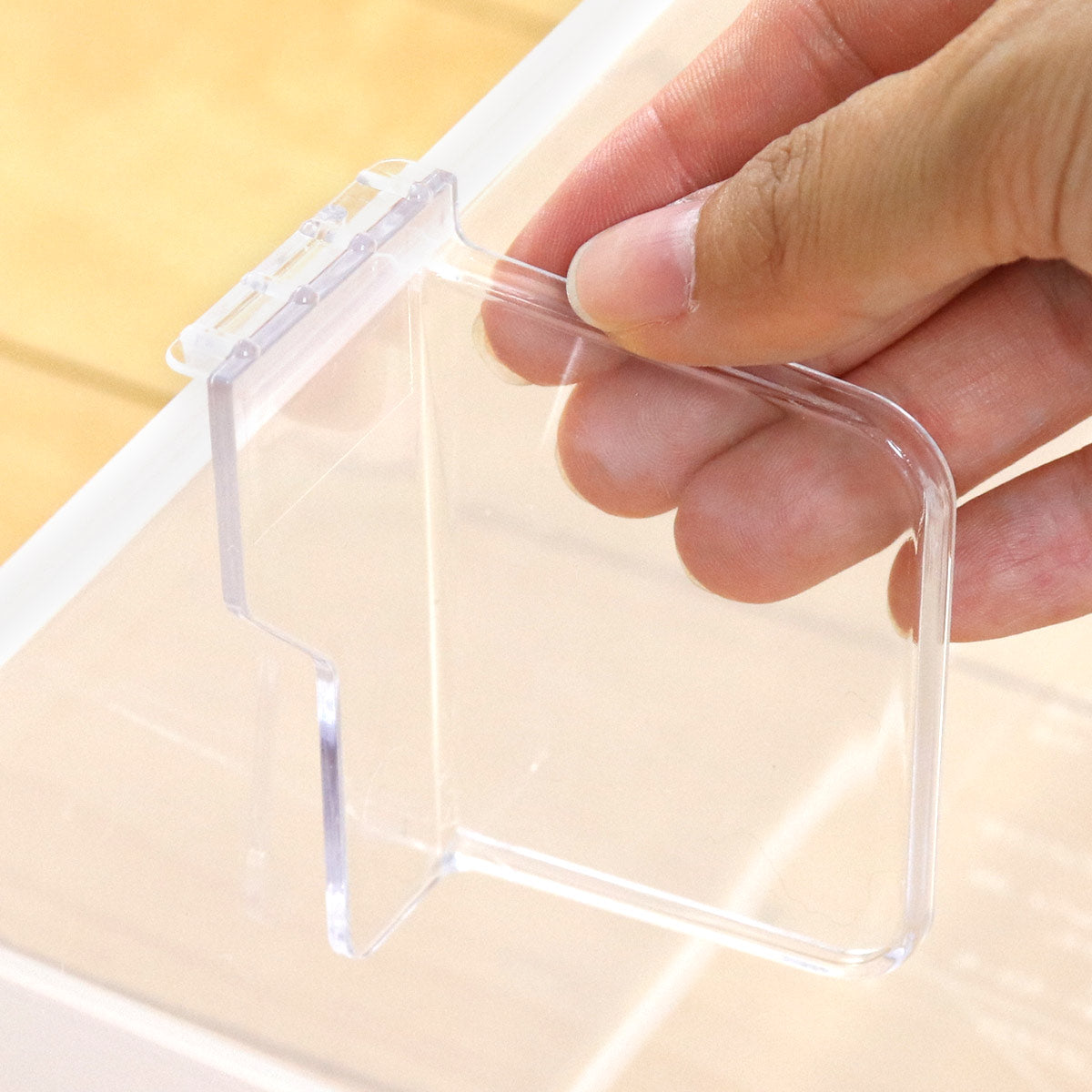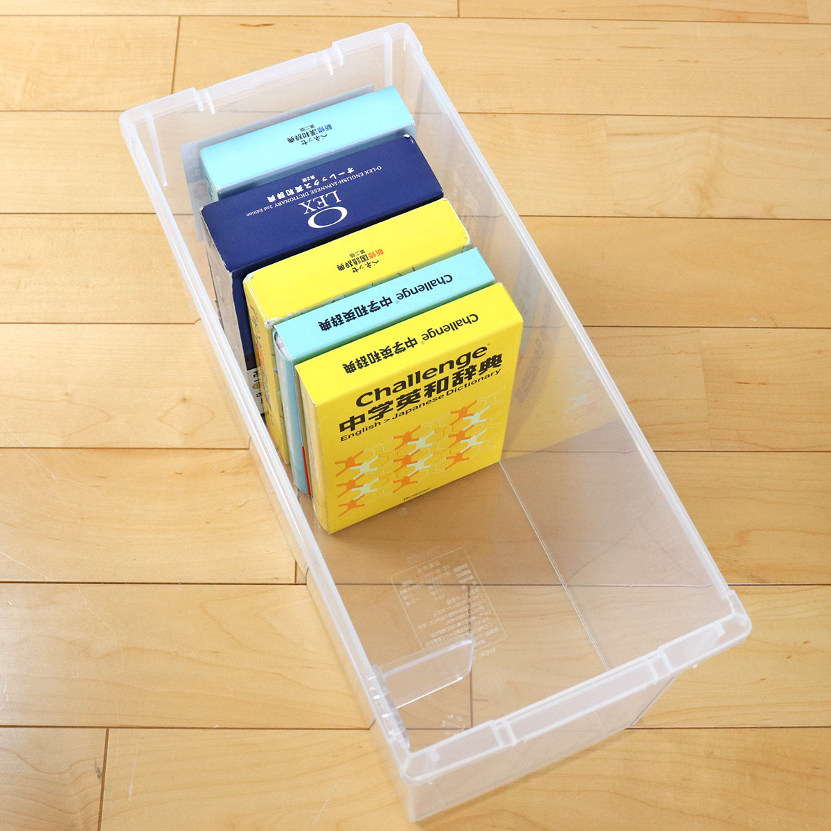フタをしていても中身が見えるオールクリアタイプなので、収納されているものが一目で確認できます。ケースに収納したままでも側面から背表紙が見えるので、積み重ねていても探しやすいです。