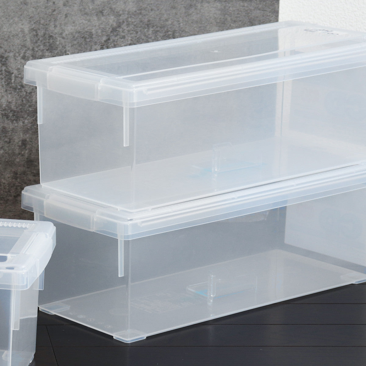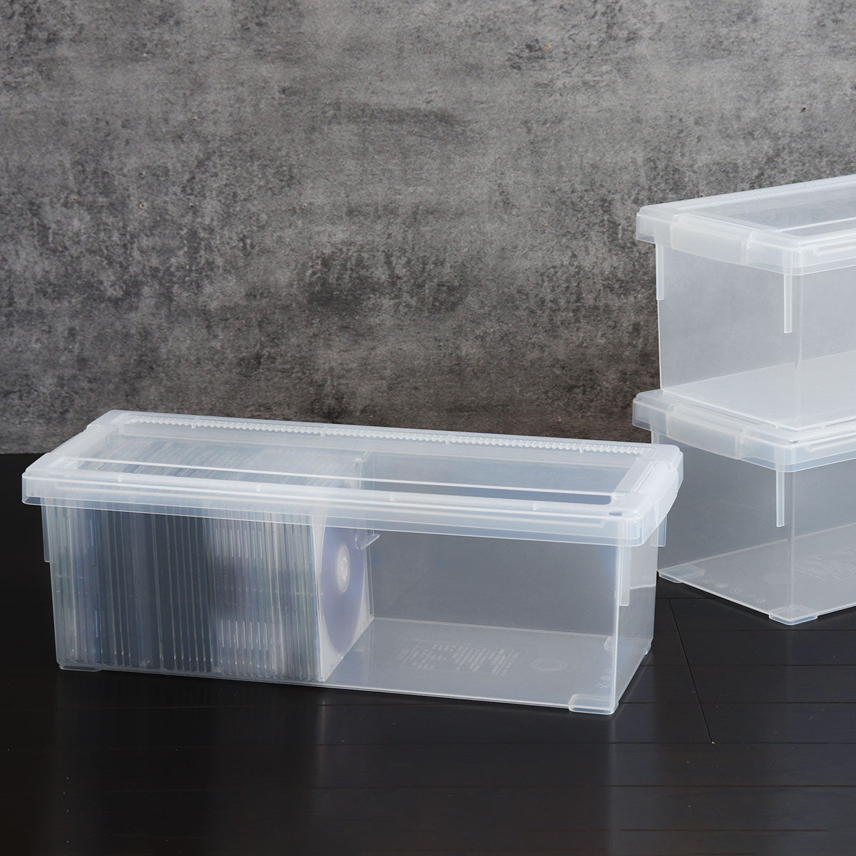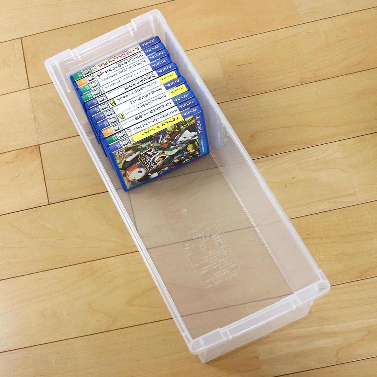 フタをしていても中身が見えるオールクリアタイプなので、収納されているものが一目で確認できます。ケースに収納したままでも側面から背表紙が見えるので、積み重ねていても探しやすいです。