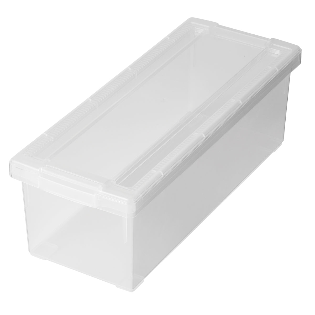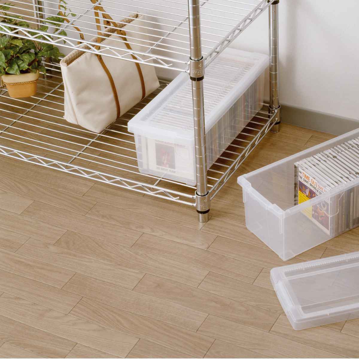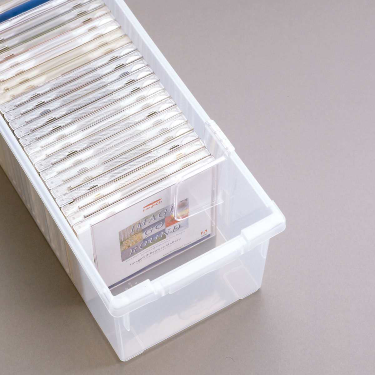 フタをしていても中身が見えるオールクリアタイプなので、収納されているものが一目で確認できます。ケースに収納したままでも側面から背表紙が見えるので、積み重ねていても探しやすいです。
