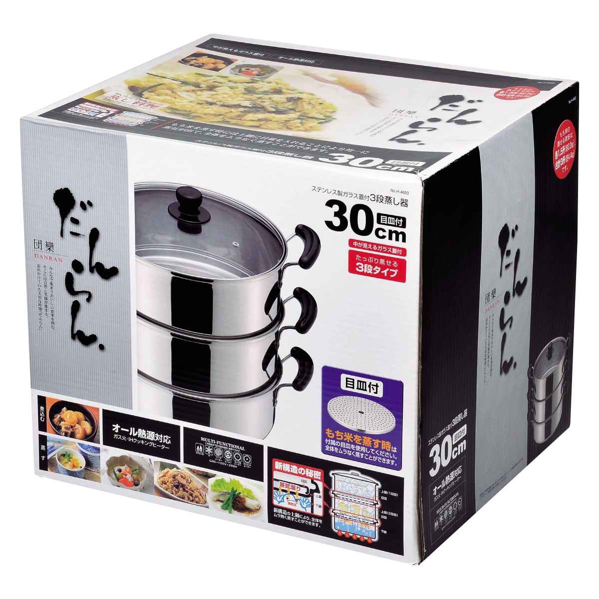 3段蒸し器 30cm IH対応 だんらん ガラス蓋付き 3升用 ステンレス製