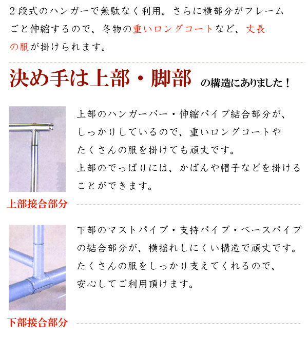 ●上部のハンガーバー・伸縮パイプ接合部分、下部のマストパイプ・支持パイプ・ベースパイプの接合部分が、ヨコ揺れしにくい構造で頑丈です。